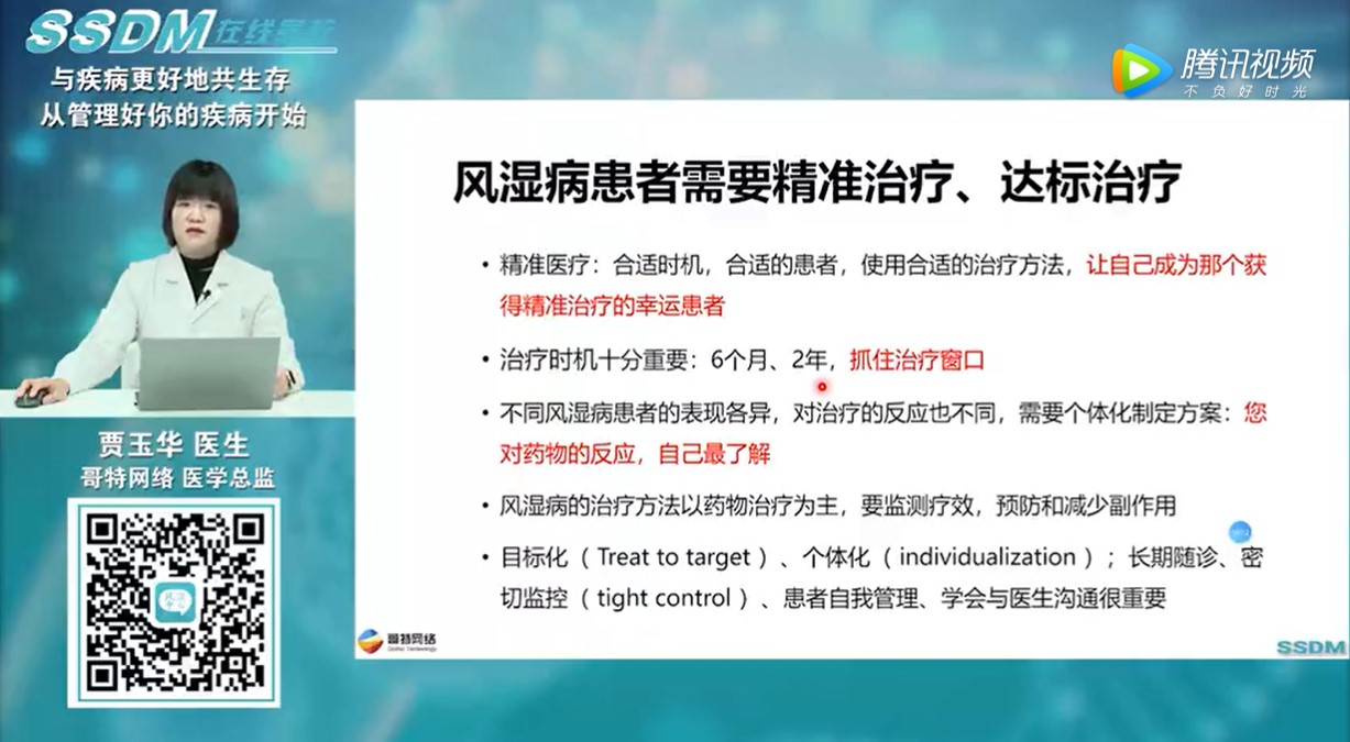 感谢大家的支持,为了让更多病友更顺利地学习到这套内容,特此在这里分享给大家。3月21日晚8:00-9:00,平台将再次开展视频直播,长海医院张兰玲教授介绍完“达标治疗-类风湿关节炎治疗的核心理念”之后,贾医生会给大家介绍“智能疾病管理优于良药”的话题,欢迎届时收看!