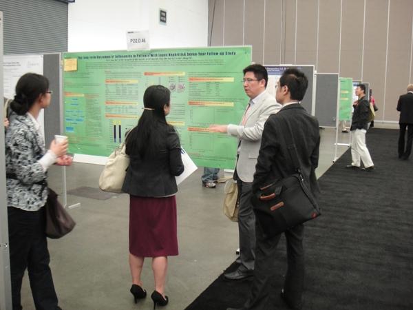 10、上海仁济医院的沈南教授,在壁报前与国际同行交流